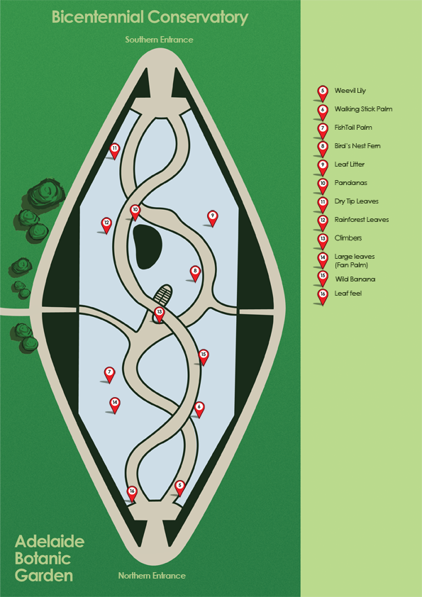 The plants on the trail are numbered and may be found by referring to the map of the Adelaide Botanic Garden and by looking for plant name labels.